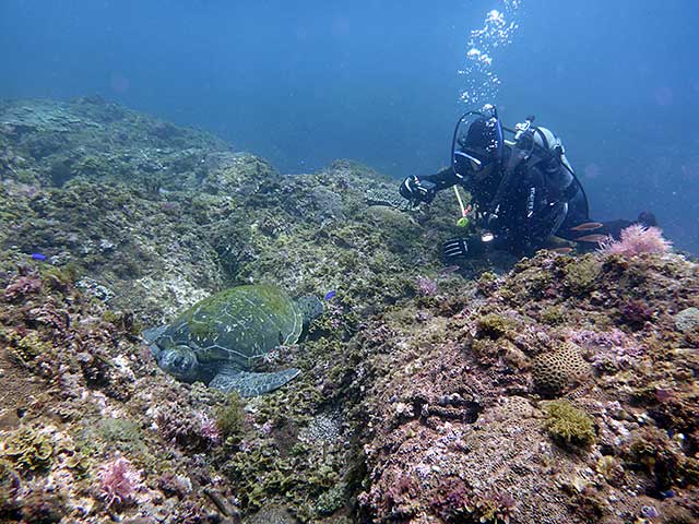 前回にいらした時には天候に恵まれずでしたが、今日は海も陸もとっても穏やかで、ダイビングポイントも好きなところに潜れる感じで、いろいろ潜ってきたりして