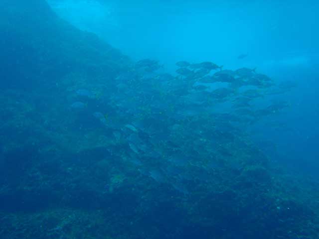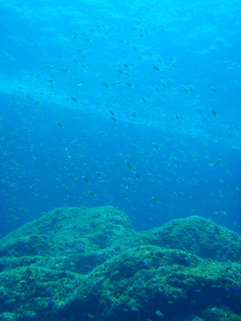 それでも、ヒレナガカンパチの群れというか玉みたいなやつや、キホシスズメダイの群れ、ムロアジもワシャワシャと集まり魚はたくさん。もちろん水面・水中・陸上ともにダイバ-もわらわらしてますけど・・・