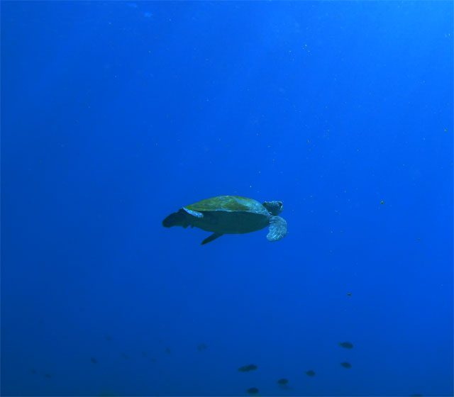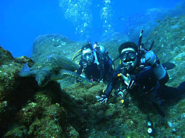 若干冷たい水も入ってきたりもしてますが、ナズマドは水も綺麗で魚もたくさん。八重根はうねりの影響も多少あるのか、微妙に白濁りしてる感じもありましたが、アオウミガメもユウゼンも蒼い海で元気に泳いでいたりして、