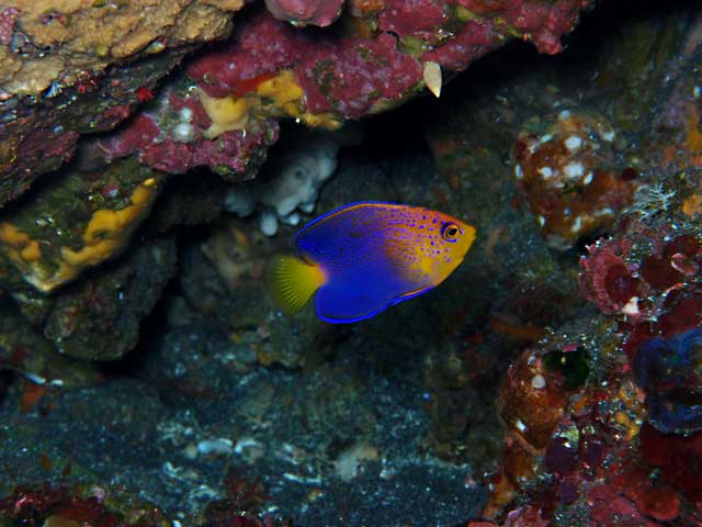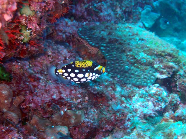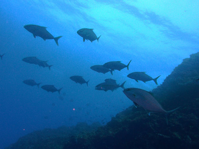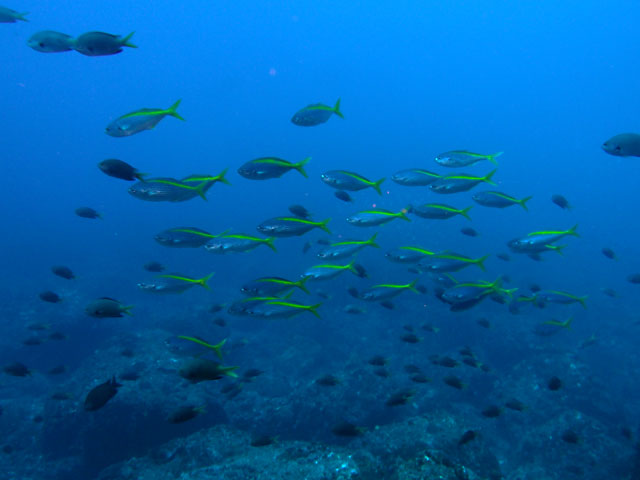 なにはともあれ全体的には夏の海と言う事で、キビナゴがたくさん入ってきており、ヒレナガカンパチなんかの回遊魚も周ってきていて、タカベも群れておりまして、浅場の岩陰にはハナゴンベの子どもや、モンガラカワハギの若魚、ちょっと深くに行くとハナゴンベやレンテンヤッコの子どもいたりして、アオウミガメもパラパラと。