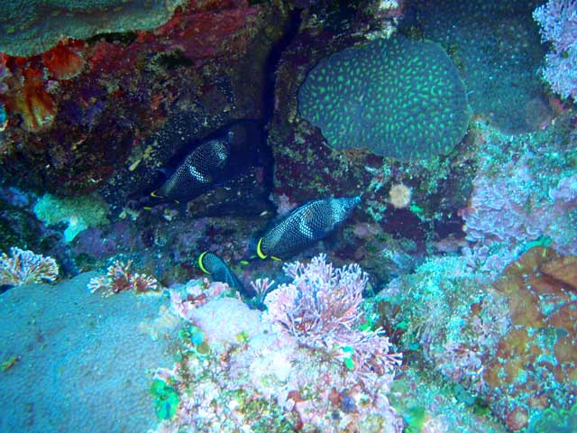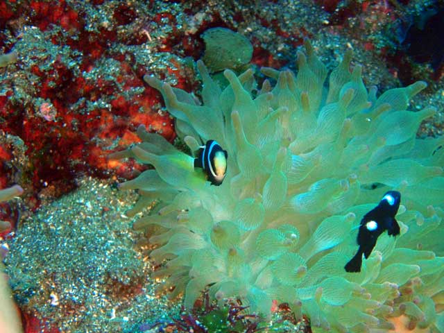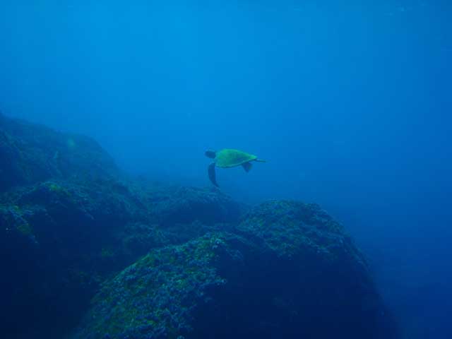 アオウミガメものんびりスイスイ泳いでいたり、小ぶりのユウゼンも集まってたりしてました。他にもハナミノカサゴやらイセエビやら、クマノミ達もイソギンチャクに出たり入ったりと、なんだか海の中はとっても賑やか。