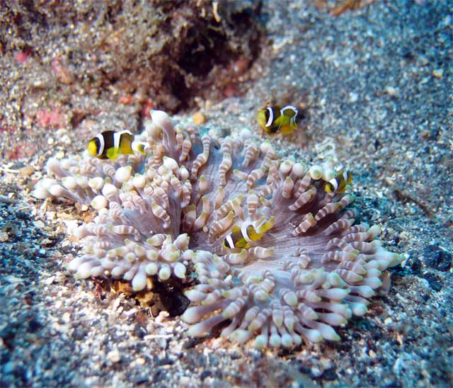 午後遅くからは八重根も少し落ち着いてきていた風でしたので、ゆっくり沖まで周ってきました。湾内にはキビナゴがワシャワシャたまって、アオウミガメもいたりして、クマノミやミツボシクロスズメダイのちっちゃな子どももたくさんで、
