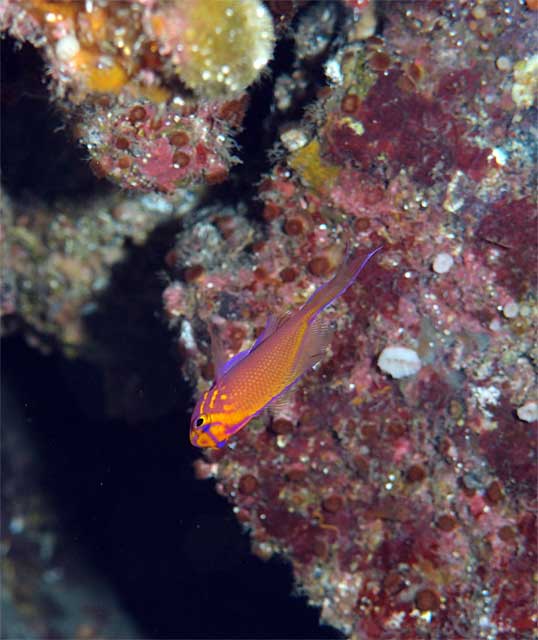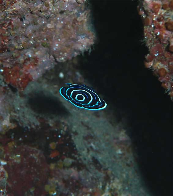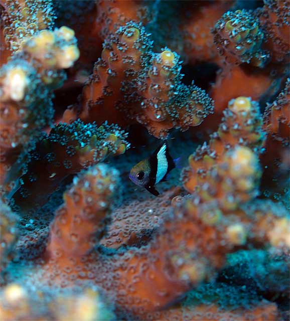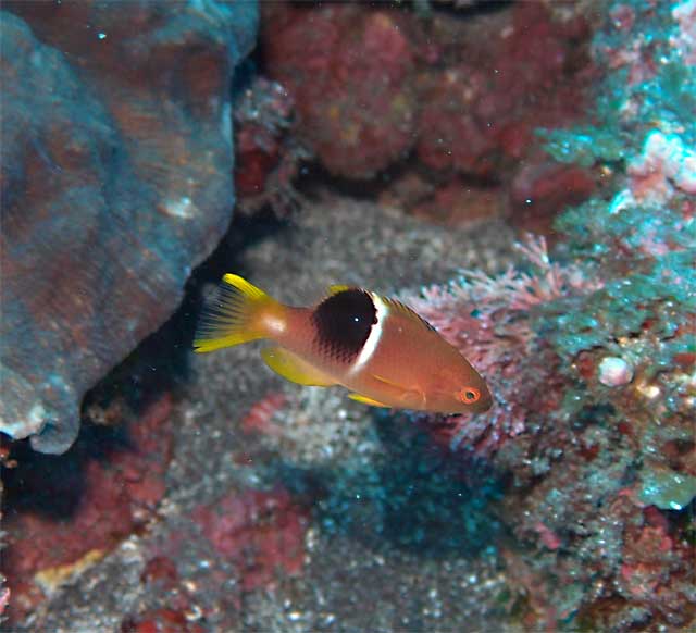 ハナゴンベとタテジマキンチャクダイの子どももスクスク育っておりまして、沖の岩陰にはタキベラの子どもも、あとサンゴの間にはフタスジリュウキュウスズメダイの子どももおりました。