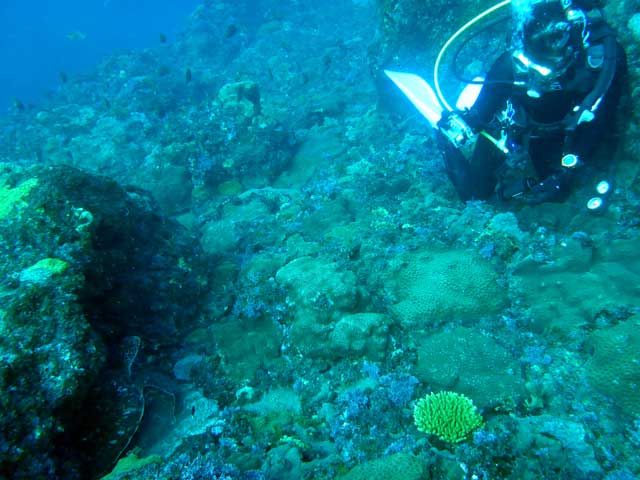 天気はよくて島影に入ってしまえばうねりも風波もそんなでもなく、入ってしまえば快適な感じで。午後早くまでは水温も24℃とここ最近ではかなり暖かくもなっていて、濁りはあるものの寒さも感じず潜れたり。