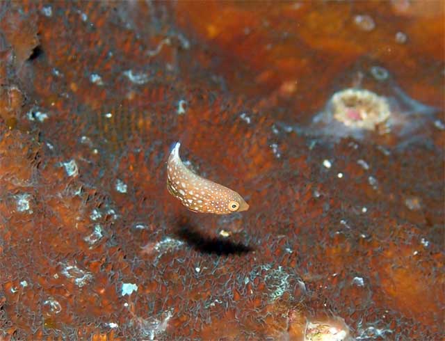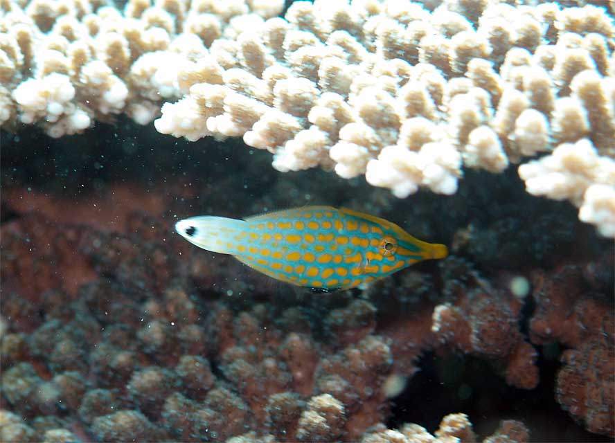 入ってすぐのところは少し白濁りもしておりますが、沖に出れば蒼い海が広がり、浅場のテングカワハギも元気チョロチョロしていたり、ホシススキベラの子どもたくさんおりまして、穴を除けばミナミハコフグの子どもなんかもいたりして、テンジクダイの仲間の子どもや、キンメモドキの子どももキラキラ綺麗に群れておりますし、じっくり探すとイロブダイの幼魚もいたりして、