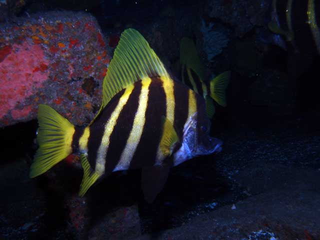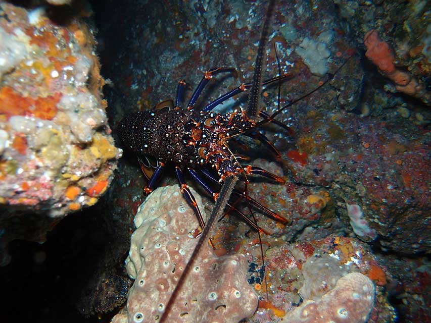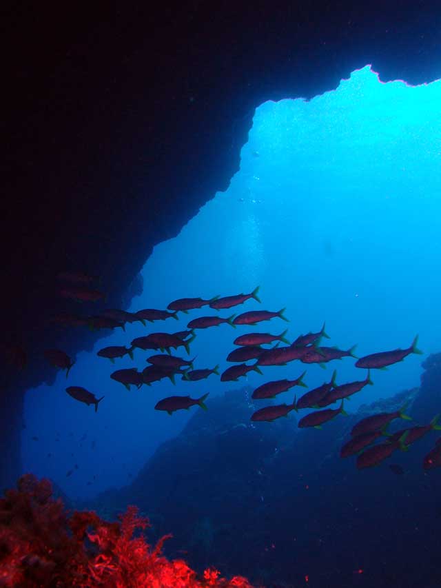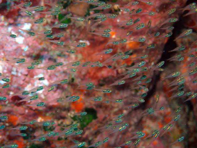 底土のアーチの下にはテングダイにアカヒメジ、イセエビとセミエビ、アーチの途中にはモンスズメダイの近似種やオウゴンニジギンポもおりました。