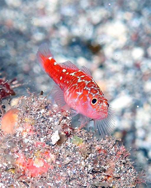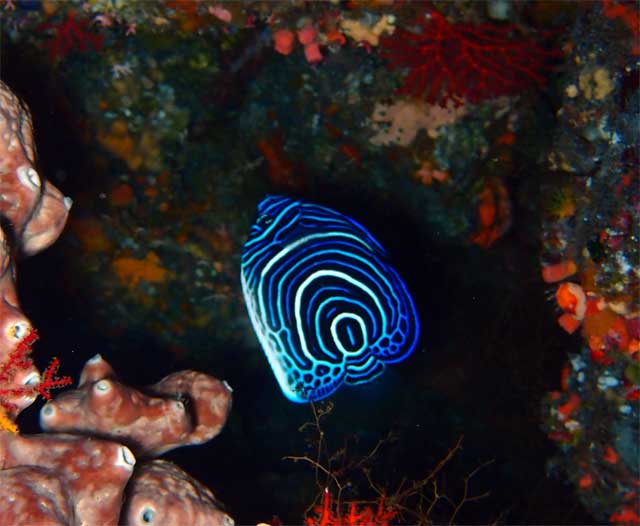 沖は少し冷たくて、小ぶりのヒレナガカンパチも周ってきてたりもしてましたが、特に大物は出ずで、タテジマキンチャクダイの子どもをとりあえず撮ってみたり、ユウゼンも十数匹集っていたりもしてまして、沖の岩の暗がりにはキビレマツカサなんかもあがってきていて、浅いところではベニハゼなんかもおりました。