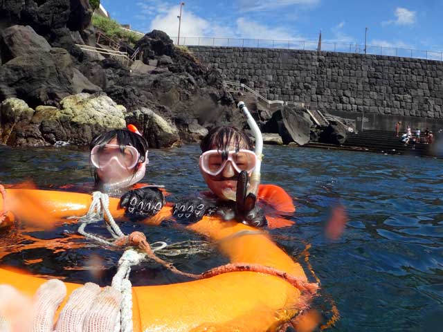 浅場でクマノミ見ながら海に慣れて貰ってちょっと外海へ。お子さま二人のご参加でご両親は陸で待っていて頂きましたが、2人とも水慣れしていて、多少の波でもぜんぜん怖がらず、キビナゴたくさんで、メジナやニザダイの大きな魚を見ながら蒼い海を楽しんで頂けました。