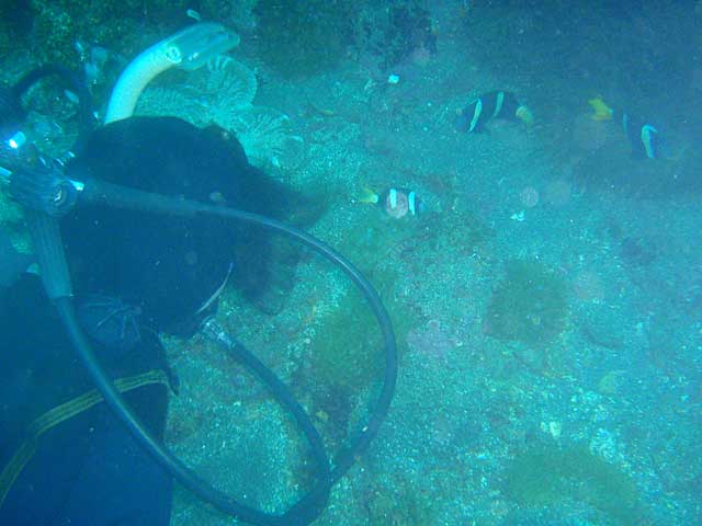 ただ、やはり透明度が悪いのでかなり近くにきてくれないとわからないのが辛いところですが、キンギョハナダイやニシキベラは集まって求愛してますし、ソラスズメダイ、クロユリハゼ、クマノミ、ミツボシスズメダイのちび達もまだまだ元気いっぱいです。