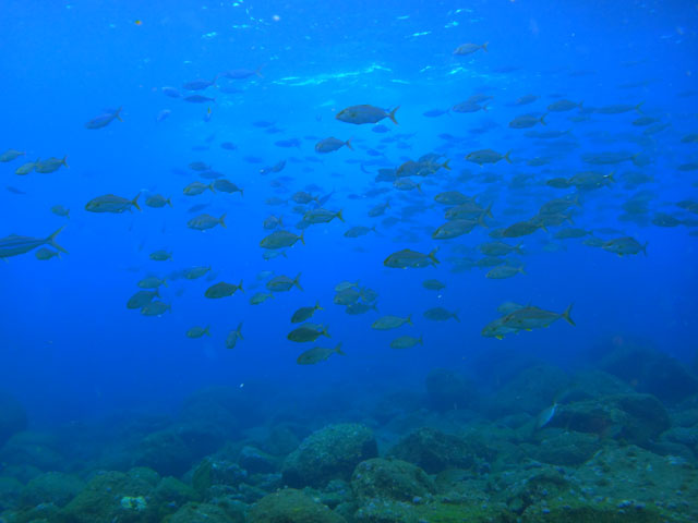 朝はまだ大丈夫そうだったのですが、八重根はなかなかのうねりが入ってきてしまっていたんで、底土に周ってサクッと一本。キビナゴもたくさんで蒼い海がキラキラしており、イロブダイの子どもや、ヒレナガスズメダイの子ども、マルスズメの子どもなんかもいたりして、早めのエントリーで込み合う前の底土の海でアオウミガメも大きいやつと小さいやつを見たりして、