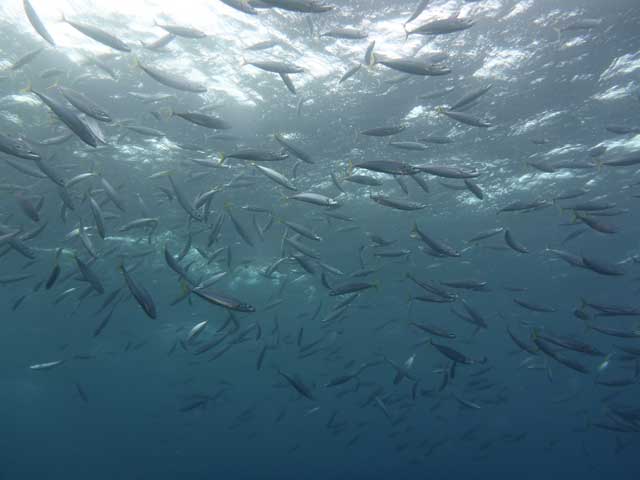入る前に、ニタリが水面を跳ねてるってのを聞いていたんで、途中、ムロアジがたくさん通っていたりするのを横目で見ながら、一気に沖まで行ってみて。