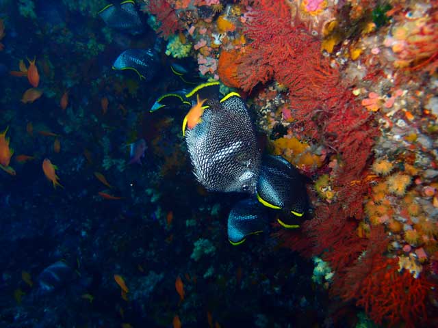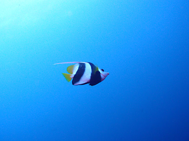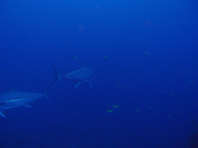 水温も浅いところは暖かですが、沖は冷たくなっていて、全体的に白濁り、ユウゼンも壁に群がり、まぁ、白濁りとはいってもなんだかんだ水はそれなりに蒼くもあったりするんで、ハタタテダイを撮りつつも、沖へ向ったワケですが、途中、魚達がやけにビクビクしている感じがしていたりもして、サメっぽさはかなり高まりつつありましたが、結局、特大のヒレナガカンパチが2匹周ってきただけでして、ウメイロが逃げ惑っていたりしておりました。