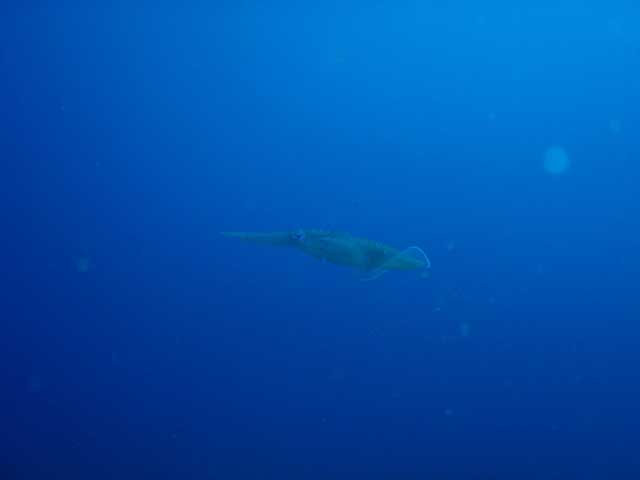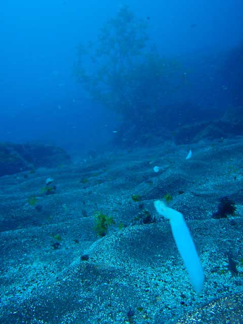 昨日のうねりでせっかく産みつけられた卵たちは少し砂地に散乱していましたが、数は少ないながらもアオリイカは間近で見られ、産卵床の辺りをフヨフヨと周っております。