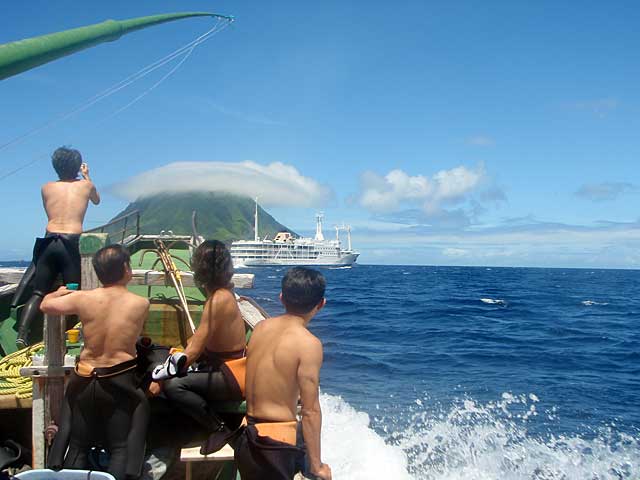 梅雨だというのに青空広がり、団体さんをお迎えして八丈小島でダイビング。波やうねりはそれほどありませんが、小島に近づき海面をみてみると・・・・ 潮目がくっきりで流れが早すぎ・・・。