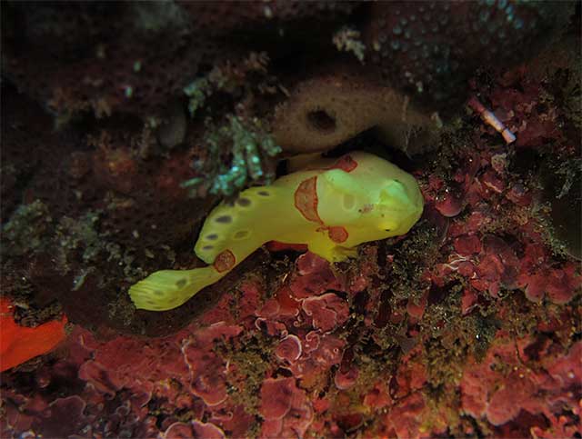 枯れ葉たまりの砂地にはツマジロオコゼや、アーチの下にはイロカエルアンコウ、アオリイカの卵の近くにはムラサキウミコチョウもおりました。