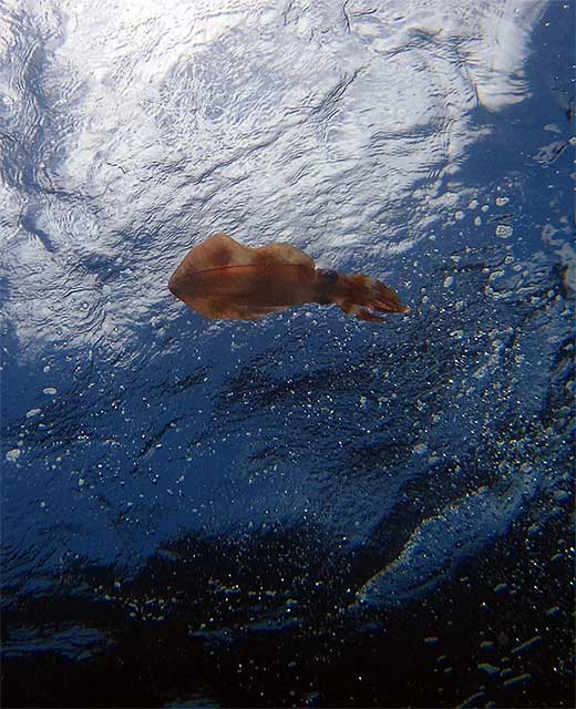 昨日に比べればかなり落ち着いてきている海の中で、キホシスズメダイたくさんいたり、アオウミガメもたくさんいたり、アオリイカもたくさんいたりで、近場には、シマアジの子どもや、ヒレナガカンパチの子どもに、産卵も終わりに近づき弱りかけのアオリイカなんかもいたりして
