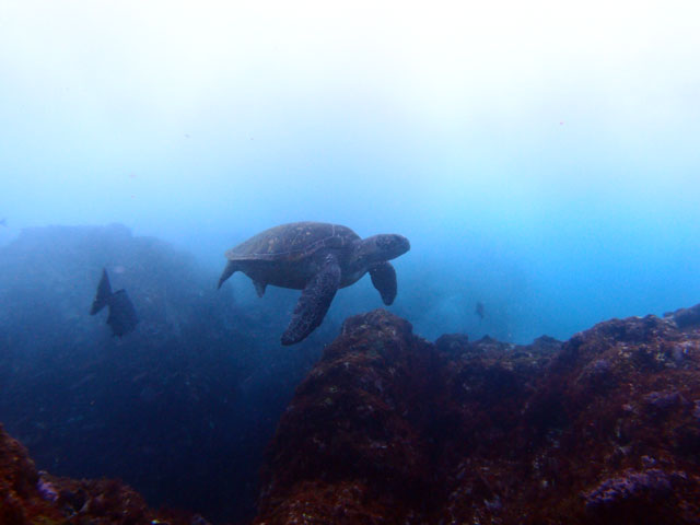 そんなこんなで、サクッとうねりに負けずにちょっと浅いところを周ってきたんですが、岸よりで波が砕けて泡だらけの水面付近にはアオウミガメもいて、メジナもたくさん、ムロアジもちょろっと周ってきてたりもしてまして、