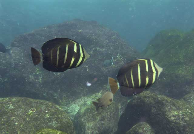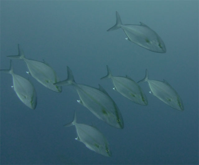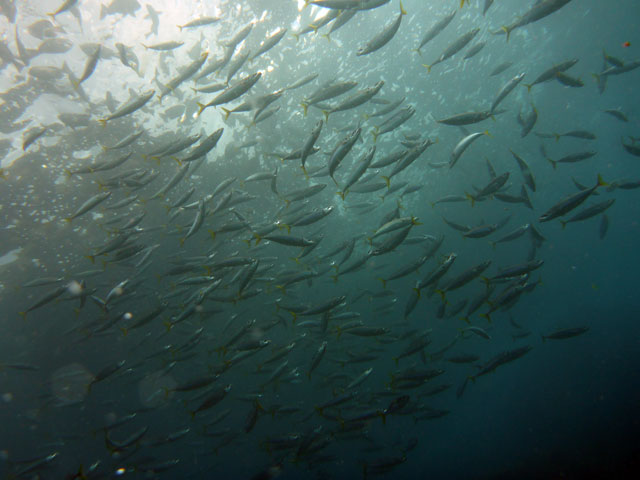 水温上がって暖かくもなっていましたが、透明度は落ち気味で。クラゲがたくさんで、ムロアジやメジナがワシャワシャ群れておりまして、ヒレナガカンパチの小さいやつや、ヒレナガハギ、