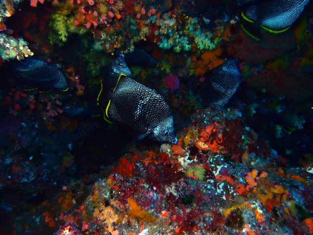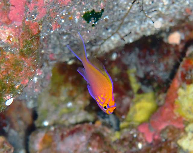北の潮がボチボチかかっていて、冷たくはあるが綺麗な水が入ってきており、上の方をムロアジの群れも通り過ぎたりして、アーチの下にはアマミスズメダイが集まっていたりもして、浅場の岩陰には台風うねりを乗り切ったハナゴンベの子どもや、今日もユウゼンはパラパラと壁際に集まっていたり、