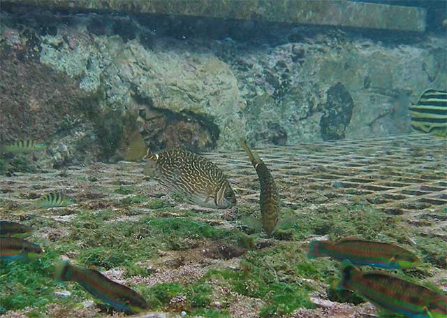 キビナゴはもういなくなっていましたが、ムロアジはまだ入ったままで、ニシキベラやシマハギ、オヤビッチャはたくさんで、アミアイゴの子どももいたりして、