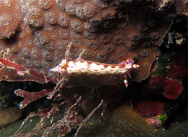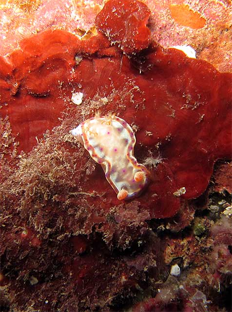 透明度はあんまりよくはないですが、センテンイロウミウシにミカドウミウシの若いやつ、ニシキウミウシにキカモヨウウミウシなんかのウミウシたちもおりました。
