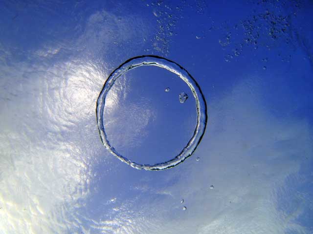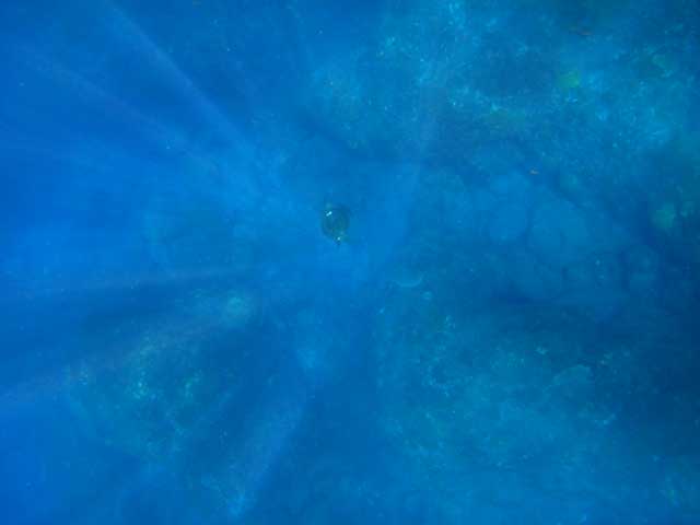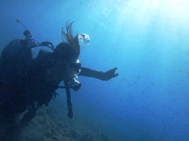 体験ダイビングでは、いつものようにしっかり説明をさせて頂き、足のつくところで呼吸と耳抜きの練習をして、キビナゴたくさんの浅場で器材に慣れて頂きながら、蒼い海へご案内。途中、エアーで輪っかも作ったりして、
