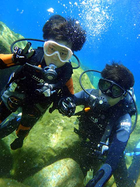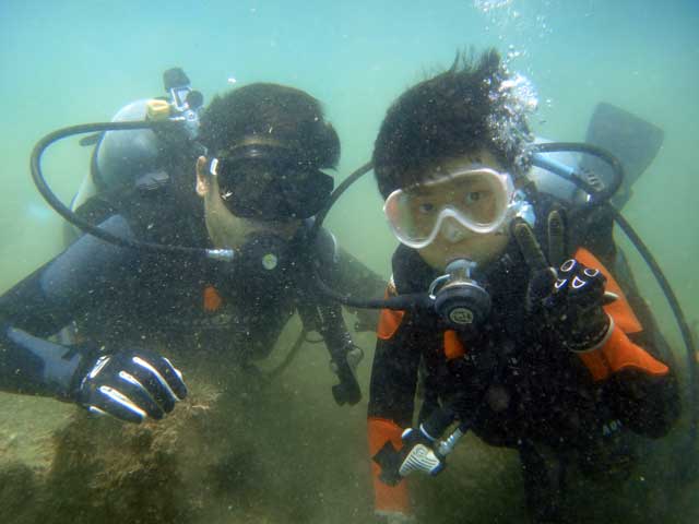 午前中は濁りはあるがとっても穏やかな神湊でしっかり呼吸と耳抜きの練習をして、じっくりと潜ってダイビングに慣れて頂き、午後からは入ってすぐに足はつきませんが、ナズマドの蒼い海でダイビングです。