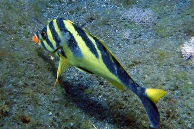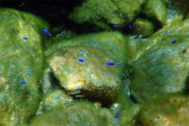 ちょっとうねりが気になりもしましたが、水も怖くない様子で水中での呼吸はまったく問題ない感じでしたので、蒼い海でキラキラ光るキビナゴの大群や、シマウミスズメダイ、チョウチョウウオやミギマキに、細長いアオヤガラや、青が綺麗なソラスズメダイなんかも見られ、浅場にはコガシラベラもたくさんで、