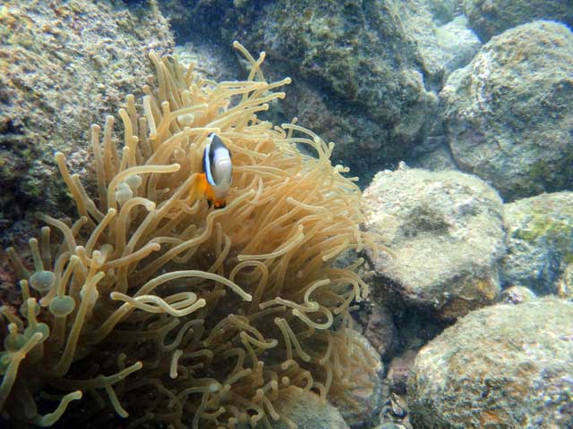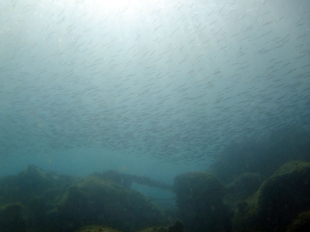 なにはともあれ、ここのところの神湊はキビナゴで覆われるくらいになっていて、それを狙ってカンパチなんかも数十匹で周ってきていて、ムロアジやアカカマスの子どもっぽいのも群れてたり、クマノミちゃんもおりまして、狭くてちょっと白濁りしておりましたが魚はたくさん。初めての体験ダイビングをうねりも気にせず安心して楽しんで頂けました。