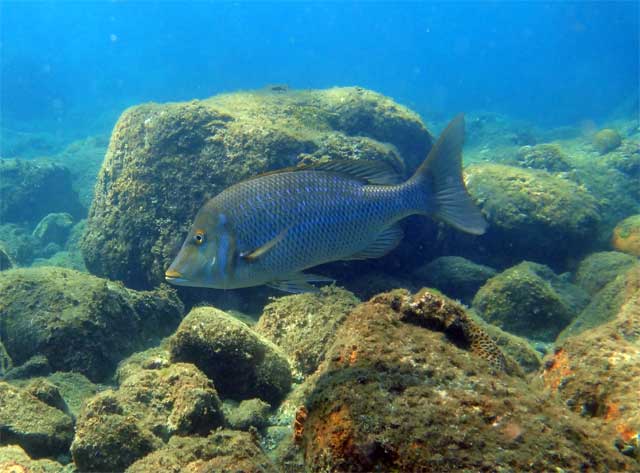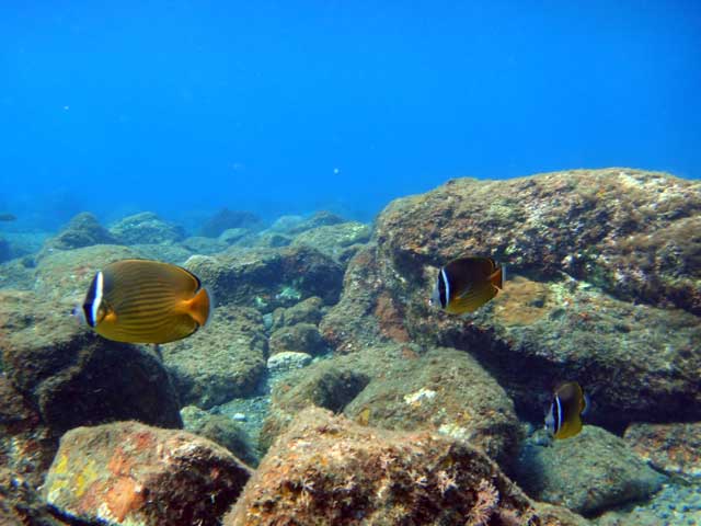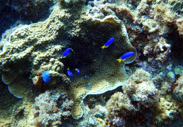午後からは、若干のうねりはありますが潮の流れもない八重根でのんびりで、とっても大きなハマフエフキや、青が光ってとっても綺麗なソラスズメダイ、チョウチョウウオもおりました。