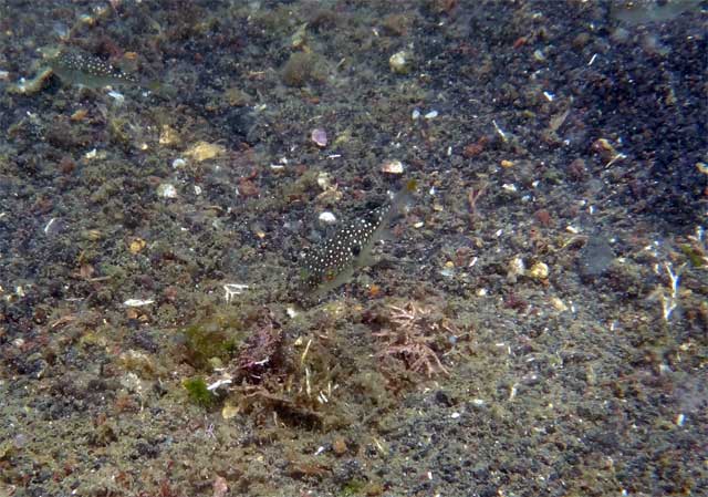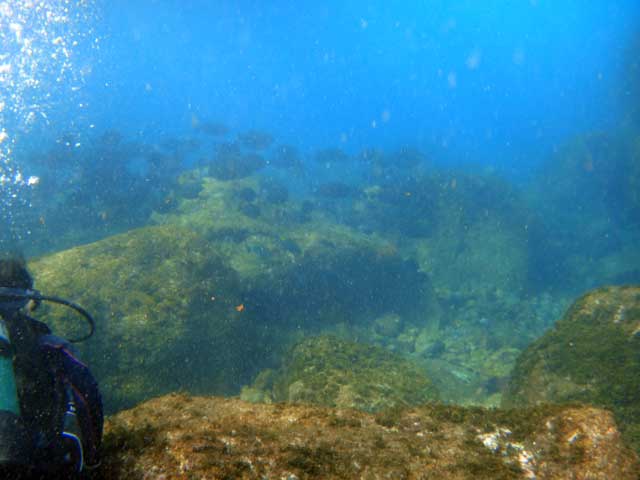 午後からは、ちょっと外海がパシャついておりましたが、頑張って頂けるとのことでしたので、崖を下って水の綺麗なアライケへ。神湊に比べると格段に水もキレイで貸切で、ベラの仲間や、ニザダイの30匹くらいの群れ、ボラの群れも見られたり、しかもここでも小さいですがアオウミガメがススーッと泳ぎ去ったりもして、白濁りはしておりますが、なんとか蒼い海をご紹介できました。