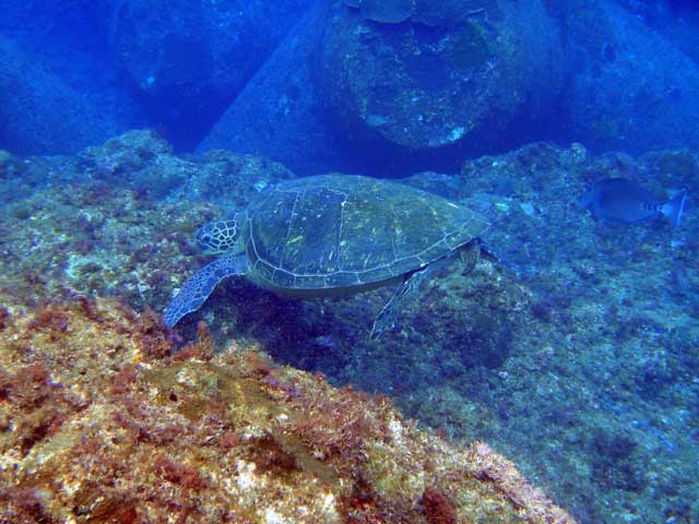 まぁ連日の底土通いということで、そこまで変わりはない夏の蒼い海が沖には広がり、浅場の砂地は白にごり。キビナゴもたくさんで、海の中にはダイバーもたくさんでした。でも、今日はなんとかとっても大きなアオウミガメも見られたりもして、