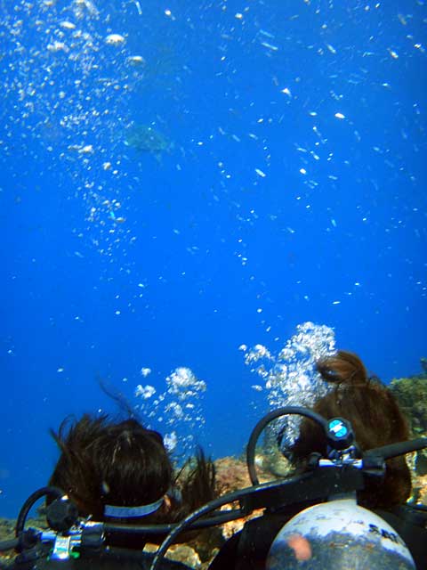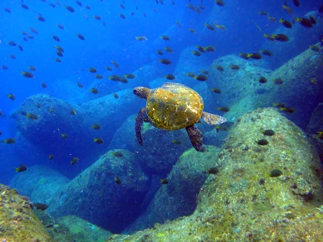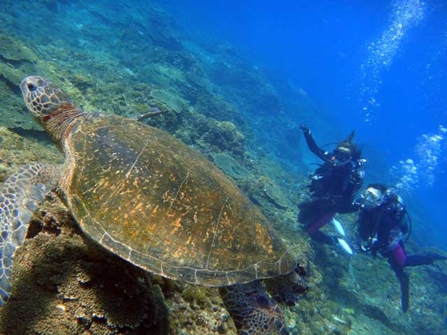 はじめての方にもおすすめの八丈島での体験ダイビング、初心者やブランクでも安心のガイドダイブ、丁寧でしっかりとしたPADI Cカード取得講習など、なによりもお越し下さるみなさまとの出会いを大切している東京から飛行機ですぐの八丈島のダイビングショップです!! [カメを求めて泳いでみたり]