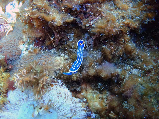慣れてきたところで、少し沖まで泳いで行って、途中、アオウミウシや、赤やら青やら色鮮やかな魚達も見つつ、グルッと泳いでアオウミガメを探しみたりして、