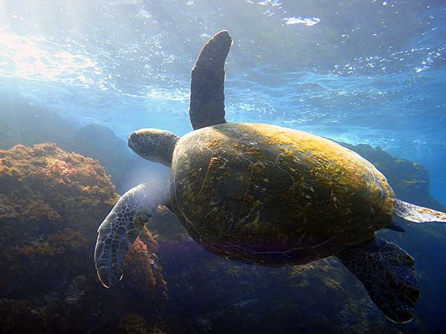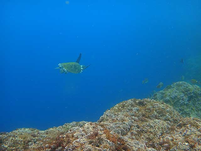 天候にも恵まれ、若干の白濁りはあるものの海の中も明るくなっていて、頑張って泳いだ甲斐もあり、遠目でも近くでも、大小何匹かのアオウミガメを見て頂けました。