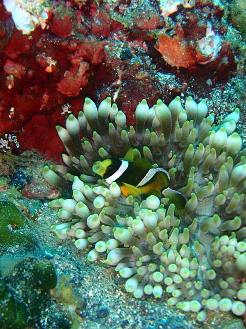 ちっちゃなイソギンチャクにちっちゃいクマノミのちびちゃん。あ~んと口を大きく開けたところをしっかり写真におさめてみたり、青が綺麗なソラスズメダイや、黄色と黒の縦じまでシャープな感じのツノダシ、ナズマドではアオウミガメもまじかで見られました。