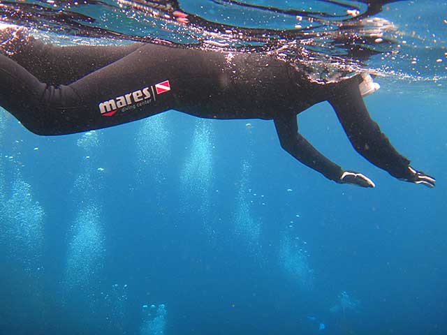 プカプカあがってくるダイバーの泡を上から見たり、夏に比べて少なくありますが、ちっちゃい魚や大きな魚を見ながら、グルッと沖を回ってきたりして、