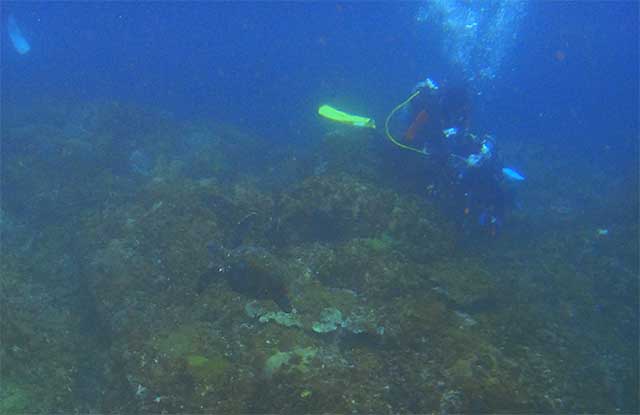若干雲は多くなってはいましたが、時折差し込む日差しは暑くもありまして、海の中もそこそこ明るい感じです。
