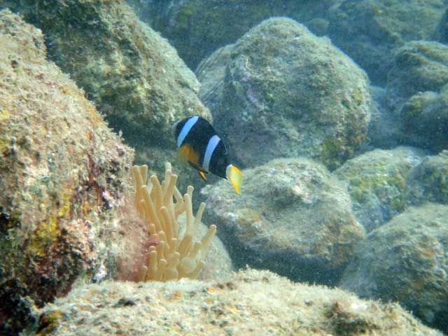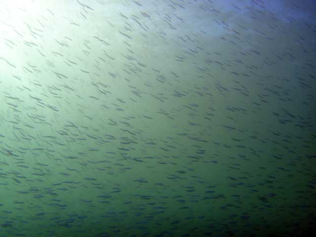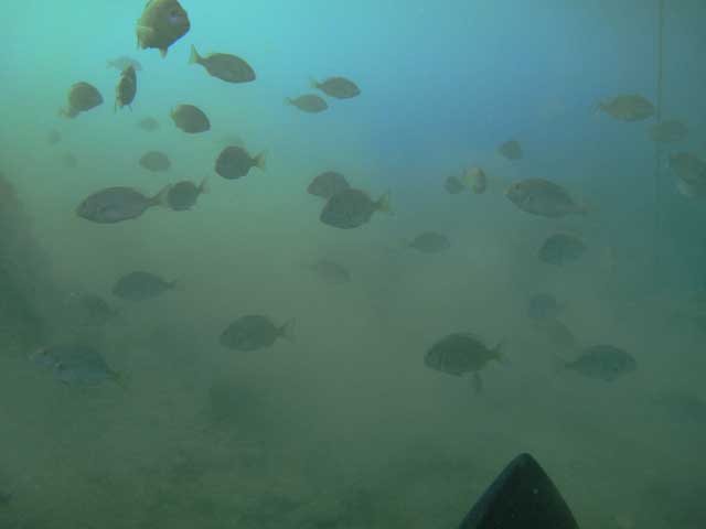 午後からはなんとか急いで海に行きたくもありましたが、こう言う時に限ってお昼の便が遅れたりもして・・・・・結局、海に行く頃には台風うねりがやってきてしまったので、濁りはありますが穏やかな神湊でキビナゴ見たり、ワラワラあとをついてくるマダイの子ども達をみて、クマノミやハナミノカサゴも見たりして、