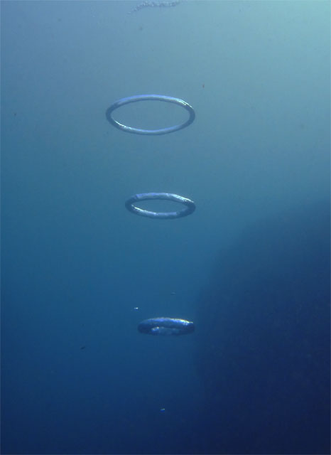 バブルリングもいつもより多めに作ってみたりもしたりして、魚も間近で見られ、キビナゴ狙ってヒレナガカンパチの群れも入ってきており楽しんで頂けたようですが、いやはや、思ったよりもうねりが早く届いてしまって、午後からはちょっと蒼い海には入れませんでした・・・・ 午後からのお客様は、ぜひぜひ、またの機会に綺麗な蒼い海に潜りに来て頂けたらと思います。
