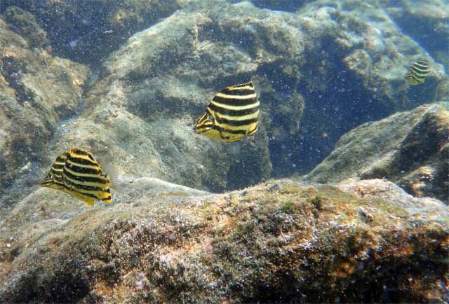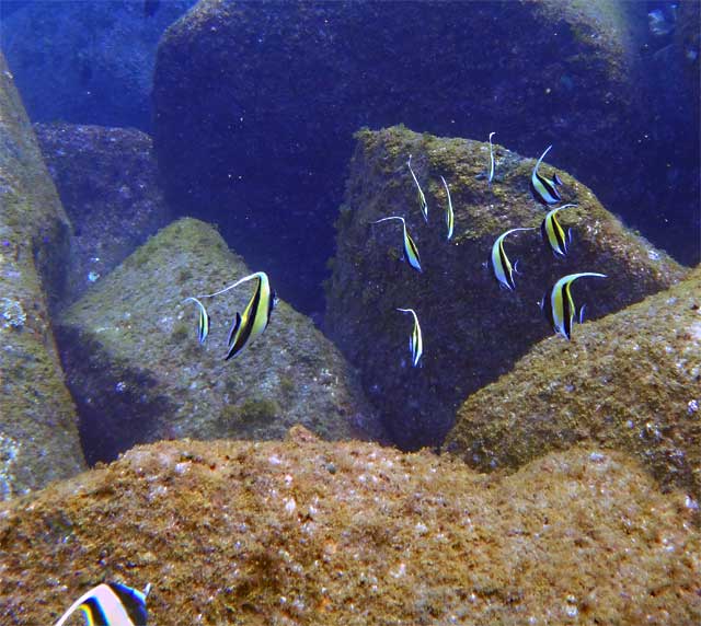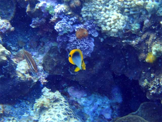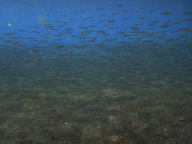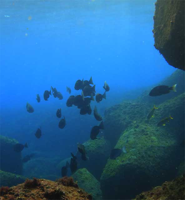 午後からはちょっと沖まで遠出して。うねりが残っているためか、若干の白濁りはしておりますが、やっぱり外海は蒼さが違う感じです。アケボノチョウチョウウオの子どもが一匹いたり、メジナもたくさん群れてたり。
