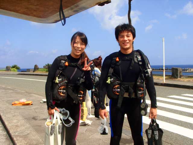 浅いところでしっかり練習してから、キビナゴたくさんの底土のちょっと深いところでいろんな魚達と遊んできました。水温も暖かで体験ダイビング中は青空もあって水の中も明るく、ダイバーで賑わう底土は秋を感じさせない感じでした。