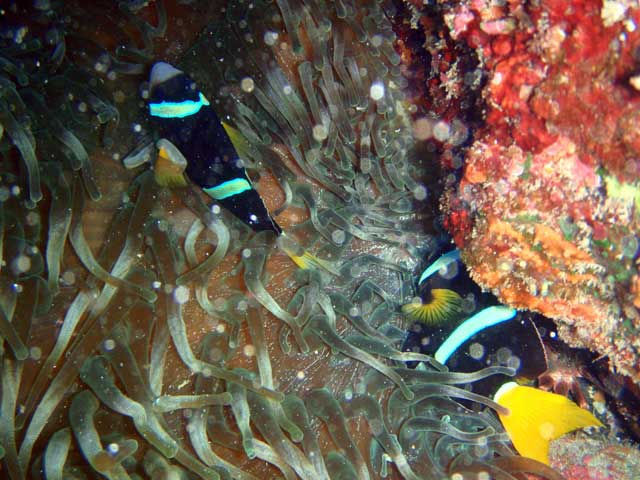 まぁ、うねりがボチボチ入っていたので、思いのほか白濁りしておりましたが、それでもちょっと沖まで出て見ればなんとか蒼い海が広がっておりまして、クマノミ見たり、ウミウサギ見たり、ソラスズメダイや、大きなカンムリベラ、ニザダイなんかもおりまして、うねりに負けずにちょこっと夏の海を体験です。