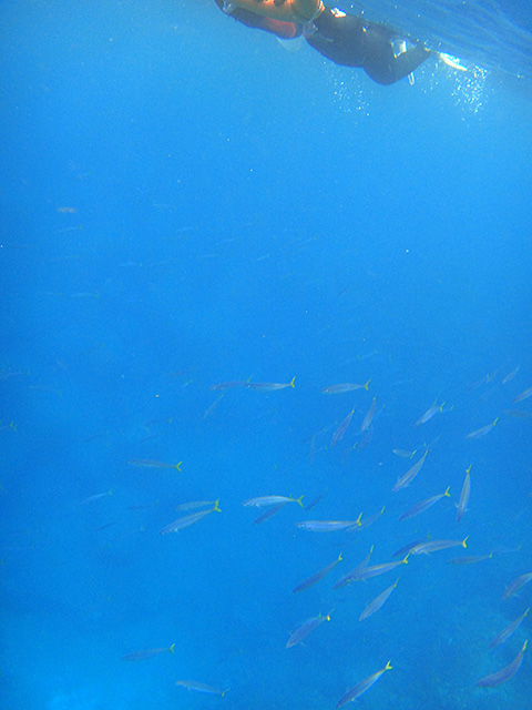 初めてのスノーケリングということですが、アオウミガメも見てみたいということなんで、足のつく穏やかなところで練習をしてから、若干パシャついてはおりましたが、頑張って今日も沖まで行ってみて、青い空に蒼い海で、ムロアジやタカベなどのたくさんの魚も見られ、アオウミガメも寝てるやつらに、泳いでるやつらと何匹か見て頂き、