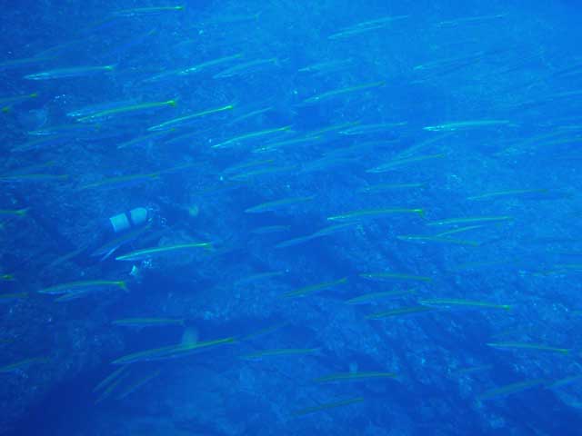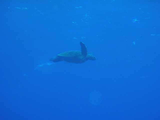 しっかり体験ダイビングでは、ちょっと外海へいって、ファンダイバーにまぎれて蒼い海で潜ります。今日はなんだかアオウミガメがワラワラ溜まっていて、同じところに4匹いました。アカカマスも綺麗にひとつにまとまって大きな群れになってましたし、夏の黒潮の海をみんなで楽しんできました。