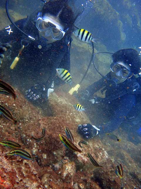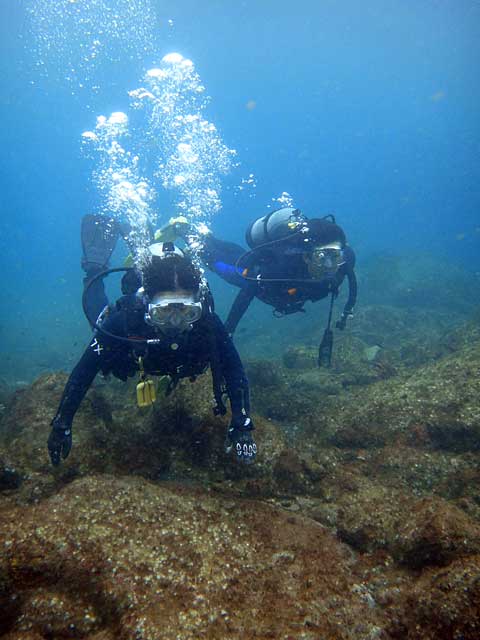 生憎の空模様となり気温もググっと下がってきておりましたが、海に入ればまだまだ暖かで魚達もたくさんです。今日みたいな雨の日は、本当に海の中の方が快適な感じで。低気圧も近づいてきておりましたが、本日も八重根のタイドプールで体験ダイビングです。