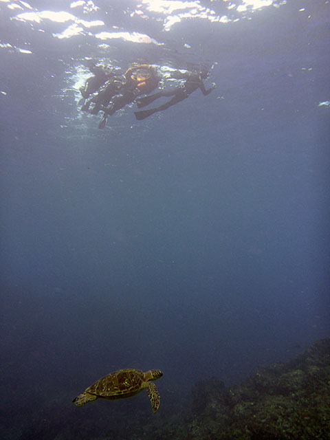 慣れてきたら、ゆっくり沖まで出ていって、時折大きなうねりも入ってきていましたが、沖に出れば水も綺麗で、大小たくさんアオウミガメもおりまして、うねりに負けずにとっても近くで見たりして、