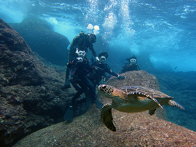 はじめての方にもおすすめの八丈島での体験ダイビング、初心者やブランクでも安心のガイドダイブ、丁寧でしっかりとしたPADI Cカード取得講習など、なによりもお越し下さるみなさまとの出会いを大切している東京から飛行機ですぐの八丈島のダイビングショップです!! [底土でウミガメたくさん見られ]