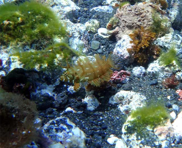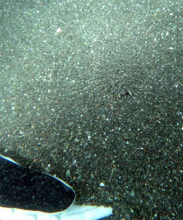 うねりもちょっと強くなっているんで、浅場の砂地は白濁り。キビナゴもたくさんいるんですけど、濁ってるんでちょっと残念な感じではありますが、カレイっぽいやつや、ヒラヒラとゴミにまぎれてオビテンスモドキや、ツノダシ達もちょい群れで、