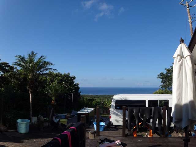 空の青さに夏の日差しで台風のうねりによる波がとってもキレイに見えるこの頃ですが、ビーチで潜れるところは東側のみということで、本日も底土を歩いて体験ダイビングです。